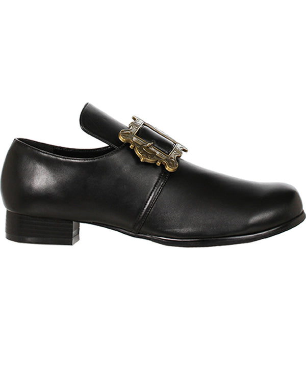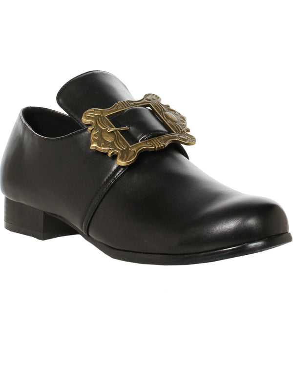 These Alvin Mens Shoes are the perfect accessory for finishing off any historical costume for Book Week and other events. The shoes are matte black and fully enclosed with a flat 2.5cm / 1in heel. This particular type of shoe features a gold antique-looking buckle on the front as seen in the Victorian era so they're perfect for Victorian Kings, plays, masquerade parties, Book Week, and even for any Hamilton dress-ups.