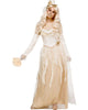 Walk the landings looking for your groom-to-be and dress for your special day in this gothic Victorian Bride Womens Costume. This costume includes an off-white gown that features skull print lace with a ruffle bodice, lace and material long sleeves and fabric flowers on the bodice. The skirt is cream-coloured with a tulle overskirt and strips of material dropped over the skirt. There is an off-white mini top hat with a large material flower attached at the side and a veil attached at the back. Complete your bridal and/or Victorian look further with accessories from our range.