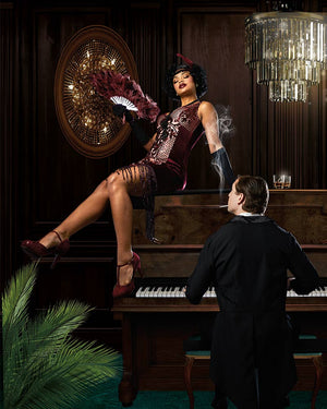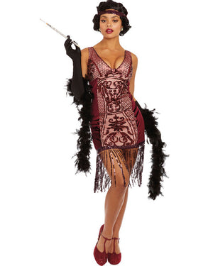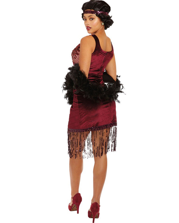 You'll be ready for the Gatsby ball in this Vava Voom Womens Costume. The costume includes a burgundy velvet dress with embroidered and sequined front panel in nude mesh. The dress also has a plunging v neckline and flirty long burgundy sequin fringe at the hem. Also included is a burgundy sequin headpiece.