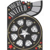 These Hollywood Movie Reel Party Invitations are shaped like old movie reels with glittery silvers stars inside the reel, with a "You're invited" headline. Inside are areas for you to fill in the pertinent party details. Invites are card style with the right hand inside page having space to fill out all your details under the headings FOR, DATE, TIME, PLACE, RSVP and the envelopes are plain silver.