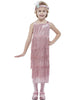 - Pink flapper dress with silver sequin patterns on body and fringed zig zag hem.