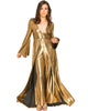 This 70s Disco Gold Womens Costume features a radiant gold dress that captures the essence of the disco era. This shining ensemble is designed with a flowing silhouette and a ruffled bodice, perfect for twirling under the dance floor lights. The metallic fabric glistens with every move, making it an ideal choice for 70s costume parties, disco themed events, or even a retro night out. Pair it with platform shoes and bold accessories to complete the look.