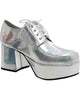 These show-stopping 70s Pimp Silver Deluxe Mens Shoes will definitely make a statement on the dancefloor. These super fancy shoes are holographic silver with white lace up the front and a platform sole and 7.6cm/3in heel. Pair up with our range of disco costumes and accessories to complete your 1970s look.