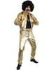 Strut your stuff to the dancefloor and dress in this statement 70s Disco Singer Mens Costume. This costume features a bomber style gold metallic jacket and a pair of matching gold pants. Complete the look with a pair of platform shoes, over the top jewellery and other accessories from our 70s range.