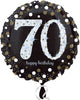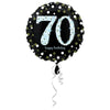 Celebrate your loved one's big birthday milestone with this 70th Sparkling Holographic Standard Foil Balloon. The balloon features the number 70 and the words 'Happy Birthday' written in silver with a holographic finish and an attractive border of white and gold holographic dots and stars on a black background.