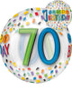 Celebrate your birthday with a splash of colour with this Happy 70th Birthday Rainbow Orbz Balloon. Perfect for celebrating the big birthday bash. Balloon is clear with '70' printed on the front in green and blue with colourful confetti scattered all over and on the side is printed 'HAPPY BIRTHDAY' in rainbow.