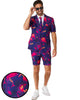 Make a perfectly pink statement with this 80s Pink Tiger Shell Suit Adults Costume. This fun costume features a bold neon pink tiger print with dazzling silver and pink panels, ensuring you stand out in any crowd. Pair it with some funky accessories to complete your look and get ready to dance the night away under the UV lights, as this suit glows brilliantly in the dark. -