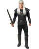 Roam the wilds of the northern realms slaying monsters with your little sister in toe wearing our The White Wolf Medieval Knight Mens Costume. Featuring a black and white top with attached shoulder and arm guards, cuffs, and a belt. In addition, the costume comes with a matching pair of Boot Tops. All you need to finish your costume is a pair of black pants a long white wig, your wolf medallion, your two swords, and of course Roach. Remember to use your silver sword for those pesky werewolves and steel swords for humans.