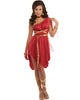 This Ruby Red Goddess Womens Costume is perfect for your next Greek or Roman fancy dress party! Whether you want to spread love as Aphrodite, be a master of war as Athena or ancient European royalty, this costume is the one for you. The costume comes with a red toga-inspired dress featuring a one-shouldered strap with a short, sheer flowing drape over the shoulder, an asymmetrical skirt with a matching sheer material overskirt, as well as gold trimming at the neckline and an attached gold belt that criss-crosses around the waist. To authenticate the costume, a pair of gold leg wraps are included to attach to your own pair of heels by threading through the straps or wrapping under the heel and up your legs.