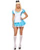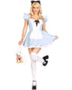 Step into the whimsical world of Wonderland with this enchanting Storybook Alice Womens Costume. This delightful blue stretch twill dress features a body-hugging fit with elastic puff sleeves, ensuring both comfort and classic charm. A crisp white faux apron with delicate lace trim cinches at the waist, contrasting beautifully with the blue dress, and the ensemble is perfectly topped off with a black bow headband, adding an iconic touch to your look. With its built-in petticoat, the skirt maintains a playful volume, making it ideal for skipping through mad tea parties and curious encounters. Pair this charming costume with white stockings and classic black Mary Jane shoes to truly complete your magical transformation. Ideal for themed parties, cosplay events, or whimsical adventures.