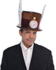 Host a tea party for your unbirthday wearing this Mad Hatter Deluxe Hat. A great accessory to finish your tea party host who also makes hats. This top hat comes in a brown patterned velour material with a large burgundy patterned band around the base with an attached gold pocket watch with a white face on the front. Two large white rabbit ears are attached on either side. A great addition or starter for a Mad hatter costume.
