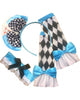 Design your own storybook blonde adventurer with this We Are All Mad Here Alice Headband Collar and Wrist Cuffs Set. This set includes a blue headband with a large black and white checkered bow with three playing cards behind it and a pair of black and white checkered gloves with blue bows and white ruffles on the ends. A great accessory to pair with other storybook characters.