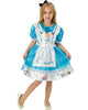 Dream of white rabbits and Cheshire cats in this Alice In Wonderland Deluxe Girls Costume. The costume includes a blue dress with white mock apron, lace trim, puff sleeves and white hem with printed character art. The attached apron is made of satin with lace trim and glitter printed 'Alice in Wonderland', an image of Alice on the chest as well as glitter heart buttons. Also included is a headband with a black satin bow and a branded pendant.