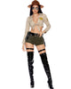 Uphold the law and command attention with our State Sheriff Womens Costume. This captivating ensemble combines the authority of a sheriff with a touch of seductive style, making you the standout star of any event. The centerpiece of the costume is the beige collared crop top shirt with a tie-up closure. The shirt also features pocket details and ornamental sheriff patches, giving you an authentic and authoritative appearance. The costume also includes contrast faux suede shorts in a dark green-brown shade. And to add a hint of allure, the costume features a black vinyl garter belt, accentuating your curves and completing the seductive sheriff look. And to finish off the costume, included are aviator glasses, adding a touch of classic cop coolness to your outfit. Whether you're attending a costume party, a themed event, or simply want to channel your inner law enforcement officer, this costume is the perfect choice.