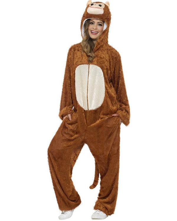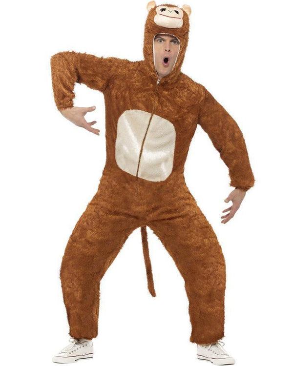 Roam the jungles with our Monkey Adult Costume. Featuring a furry brown jumpsuit with a white stomach, attached tail and hood resembling a monkey head. The costume also features a long front zipper for ease.