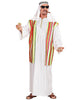 Embark on an enchanting Arabian adventure with this Sheik Mens Costume. This costume features a pristine white robe paired with an attached striped vest, embodying the elegance of a sheikh. The white headpiece, complete with a silver ornate band, adds a touch of authenticity to your transformation. Pair it with a gold chain or a cigar for a complete look. Ideal for themed parties, costume parades, or theatrical performances, this outfit promises to transport you to a realm of fantasy and intrigue.