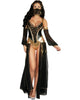 Dance your way through the shadows in this alluring Dark Harem Nights Premium Womens Costume. The costume starts with an enchanting black and gold teddy style bodysuit with gold accents and lace. The neckline of the bodysuit is a low 'V' neck with black lacing. Around the back of the bodysuit is a black lace panel and for the fit, is a cheeky high-cut design. There is a pair of intriguing gold leg straps, featuring attached black chiffon trains that billow and cascade with every step, adding a touch of ethereal elegance to your silhouette. Secured with a discreet clasp at the back. For an elegant effect, there is a pair of black chiffon sleeves that have thick metallic gold cuffs and sit at your upper arms and wrists. To conceal your true identity, a black chiffon mask covers the lower half of your face, leaving admirers yearning to uncover the secrets hidden beneath. Complete the captivating look with the gold chain headpiece with a large rhinestone at the centre.