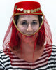 This Red Harem Hat is the perfect accessory to complete your Arabian Nights or Genie look. This red satin pill box shaped hat features a sheer veil edged with gold braiding with a strand of faux gold coins attached to the front.