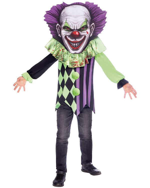 Step into the nightmare realm with our bone-chilling Scary Clown Big Head. This terrifying creation features a large clown print mask with hyper-realistic facial features that will haunt your dreams. Complete with a green collar attachment fitted with freaky blood stains, this mask is sure to send shivers down your spine. The half-and-half clown top adds to the eerie atmosphere, with long black and green sleeves, a green and black diamond detail on the right side, and a purple and black stripe detail on the left side. Whether you're looking to spook your friends at a haunted house or unleash your inner clown nightmare, this costume accessory is guaranteed to leave a lasting impression on everyone who crosses your path!