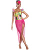 Samba into the night with this Chiquita Womens Costume. This vibrant yellow bodysuit bursts with tropical prints and playful pink, blue, and yellow mesh ruffles on the shoulder straps. A sheer pink mesh sarong adds a seductive, flowing touch, perfect for dancing the night away. To crown your festive look, a dazzling pink sequin headpiece is adorned with colourful fruit and floral embellishments. You'll be the sweetest, most irresistible sight at the party.
