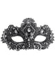 - Black eye mask with ornate silver lace detailing and rhinestone embellishments.