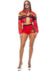 Rev up your style with a flash of speed wearing this I Am Speed Womens Costume, inspired by Lightning McQueen. This striking costume features a triangle top, along with shorts adorned with "LIGHTNING" and a "95" patch, paired with a flame print cropped jacket for a fiery look. The checkered neck scarf adds a classic racing touch, while the included glasses complete the look with flair. Perfect for costume parties, themed events, or a daring night out, this outfit promises to turn heads and ignite imaginations. Pair with bold makeup and high heels for a complete racing queen transformation.
