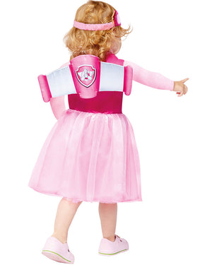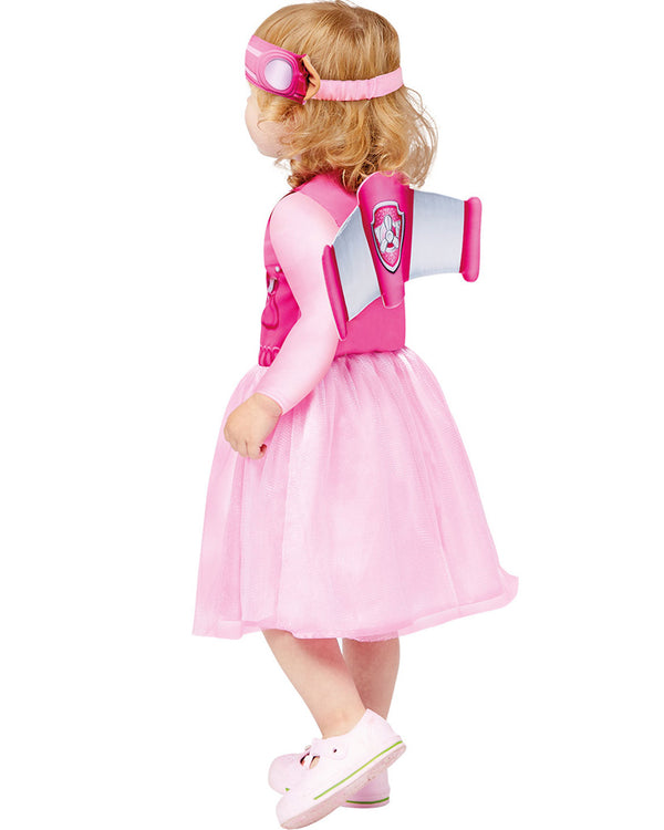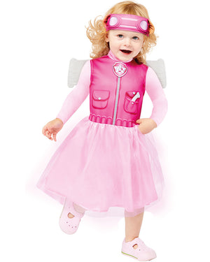 Any little Paw patrol fan will be guaranteed to adore this Paw Patrol Skye Toddler Girls Costume. The costume includes a light pink long sleeve dress with tulle and satin skirt as well as hot pink vest with faux pockets and zipper. Attached to the back of the dress is a set of pink and white wings. Also included is an elasticated pink goggle headpiece.