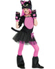 Fun awaits with this Miss Kitty Girls Costume. Your little one will be purr-fectly adorable in this charming black velour dress, complete with an attached plush tail ready for wiggles. A shimmering black glitter tutu skirt adds a touch of playful sparkle, while a sweet pink chest inset on the bodice and a matching pink satin bow on the waist make this look extra special. Little paws will stay cozy and cute in the fluffy black mitts with pink accents. The fluffy black hood, featuring perky cat ears and sweet face details, is adorned with another darling pink satin bow. Finish off this paws-itively delightful look with the fluffy black boot covers, and get ready for endless fun and giggles.