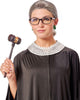 - White lace jabot choker and black framed glasses.