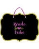 Complete your Hens night decorations with this Bachelorette Bride Tribe Chalkboard Sign. The sign features a black chalkboard with the words 'Bride Tribe' written in the middle with an image of an arrow and heart. The sign also has a gold boarder and a pink ribbon handle. Combine with our range of Hens party supplies including party cups, party plates, tablecovers and more.