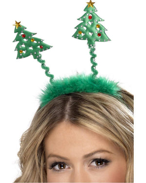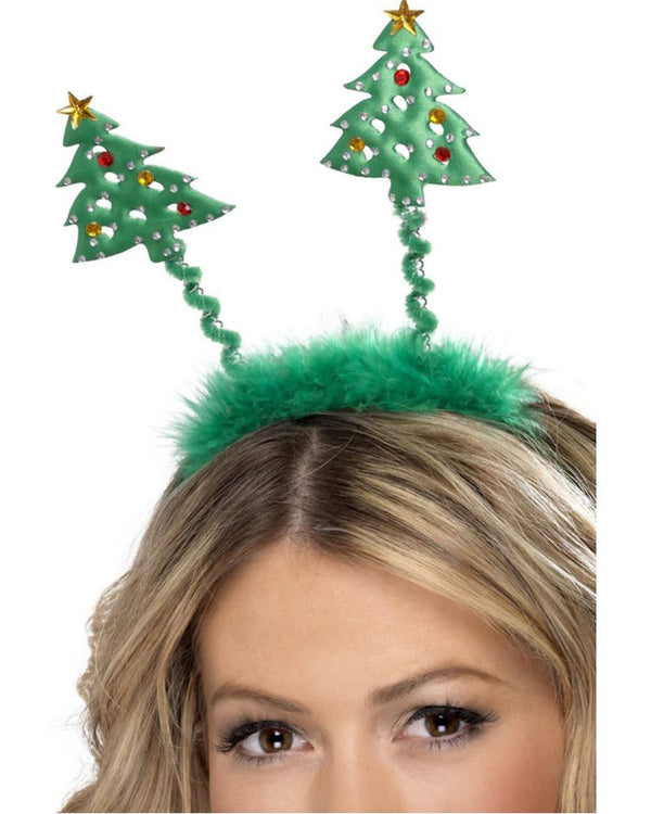 Top off our Christmas outfit with our Christmas Tree Bobbers Headband. That features Christmas boppers with a furry headband, attached with Christmas Tree bobbers styled with a gold star, silver, red, and gold gem accents. Great as a Christmas accessory for a work Christmas party.