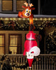- Inflatable Santa lying across white brick wall.