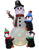 Bring a touch of the White Christmas to your front yard this festive season with the Snowman and Penguins with Disco Light Lawn Inflatable 2.4m. Included is a large, white inflatable snowman with three small, black inflatable penguins attached. They appear to be hugging the snowman, how cute! Snowman wears a black hat, a red-and-green-striped 'scarf' and red 'mittens'. He has cute printed facial features, three black buttons down the front, and an orange inflatable carrot nose. The little penguins each wear a different coloured hat and scarf in blue, red and green. Standing at a total height of 2.4m (8ft), this is no small Christmas decoration and is sure to put a smile on the faces of all who pass by. It looks fabulous at night thanks to the built-in LED lights, and has a surprise lighting feature of red-and-green disco lights in the bottom 'snowball'. Merry Christmas!
