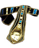 Complete your next Egyptian Pharoah costume with this Egyptian Belt. The belt is black with gold trimming and sections of blue and godl throughout. In the middle of the belt is a tie shaped section that hangs down from the middle in traditional Egyptian style.