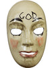 This Halloween finish your costume with our The Purge God Half Mask. Inspired by the god mask from the horror flick The Purge: Anarchy. Featuring a pale white half mask styled with black eyebrows, red blotches, patchy lipstick words GOD written on the forehead. Great for dressing up as this Halloween!