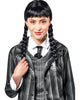 This Wednesday Nevermore Plaited Black Wig is the perfect addition to your Wednesday Addams costume or outfit. This wig captures Wednesday's signature two plaits hairstyle from her new standalone Netflix series Wednesday. The wig comes in black styled with two long plaits, thick fringe in the front and a middle part. Whether you want to show off your fandom for the character this Halloween or any occasion, then pair this wig with any Wednesday Addams costume. Wear a wig cap for added comfort and to keep your own hair under wraps.