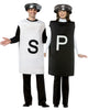 Have fun at your next party wearing this Salt and Pepper Couples Costume. This hilarious costume features two long tunics; one black and the other white. The black one includes a printed white 'S' on the front and the white one has a black printed 'P' on the front. To show you are salt and pepper shakers there are two included hats in the shape of silver 'lids'.