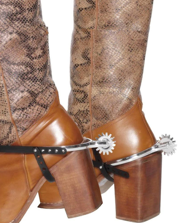 Add an authentic touch to your cowboy outfit by adding these Silver Spurs to your boots. The silver spurs fit easily on most boots as they feature adjustable black straps that fit around the front of the boot and connect to another piece that goes underneath the arch of the boot. You'll be ready for any Western-themed party in no time.