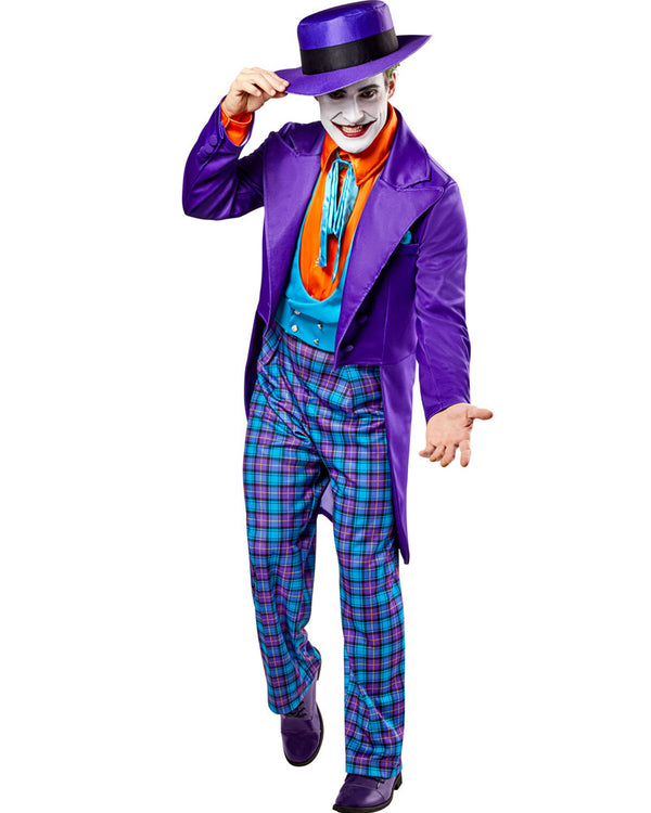 Transform into the clown prince of crime in our 1989 The Joker Deluxe Men's Costume. This vibrant costume features a striking purple tail jacket with wide lapels and a stylish blue pocket square sewn into the front pocket. There is a shiny orange shirt, bright green tie, and vivid blue vest create a bold, iconic look straight out of the Batman film. Complementing the jacket are purple and blue checkered pants with an elastic waist for comfort. Top off the Joker look with the included purple bowler hat adorned with a black band, capturing the Joker's unforgettable style. This iconic outfit is based on the suit worn by Jack Nicholson aka The Joker, in the 1989 Tim Burton movie Batman.
