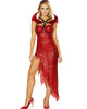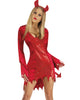 Rule the fiery depths of hell, in style, and dress to impress for your subjects in this Devil Womens Costume. This costume comes complete with an all in one dress that features long shirt sleeves in a red satin-like material, a fiery red and yellow flame printed design across the chest and an attached black vest with gold decorative edging and buttons that sits under the bust. There is a black high collar with red edging which secures at the neck. To show off your devilish side, there is an included headband with a pair of red horns attached at the top.