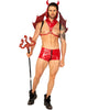 Rule the fiery depths of hell, in style, and dress to impress wearing this dashing Devil Mens Costume. This costume comes with an all-in-one shirt and vest that features long shirt sleeves in a red satin-like material, a fiery red and yellow flame printed design across the chest and an attached black vest with gold decorative edging and buttons. There is a long red cape made from silk-like material with a high collar and secures at the neck. To show off your devilish side, there is an included headband with a pair of red horns attached at the top.
