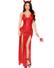 Bring out your devilish side in this sultry Devil Mistress Womens Costume for your next spooky party. This sexy costume comes with a silver glitter dress with a jagged hemline and a high slit on one side. The dress features a black attached harness that wraps around the bodice with a pair of mini red metallic devil wings attached around the pack. Complete this sinfully evil costume with devil accessories from our range.