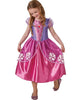 Fans of Sleeping Beauty can dream even bigger in this Disney Princess Aurora Sparkling Tutu Dress Girls Costume. The deep ruby pink bodice of the dress is made from a stretch jersey material to keep little princesses comfortable all day. The front features a pink sparkly sequin panel in the centre and character-printed heart gemstone on the neckline. Organza ruffles are attached to the shoulder straps. The tutu has an integrated leotard pant with a multi-layered tulle skirt in light pink.