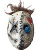 Wear this Voodooman Deluxe Mask to complete your voodoo doll or wear it on its own for your next Halloween party. This mask features a white weathered doll like face with large stitching down the centre and a cross stitch over one of the eyes. There is a scattering of colourful polka dots around the top of the mask, a red heart attached to the side and just below one of the eyeholes is a blue button. Attached to the top of the mask are scruffs of brown hair.
