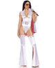 Rule Las Vegas in style with The King Womens Costume, a seductive homage to a rock 'n' roll legend. This daring costume includes a white bodysuit that features a plunging collared neckline with ornamental silver hardware. There are attached white garter straps and, a short white cape at the back, lined with dazzling red sequins and secured with velcro tabs. Flare thigh highs with sultry side slits to elongate your legs, making every step a showstopper. A white wide waist belt, with a chunky silver buckle, cinches your waist for a striking silhouette. Complete the look with the included pair of aviator-style costume sunglasses, embodying the charisma and confidence of a rock legend. Unleash your inner Elvis Presley and make a grand entrance.