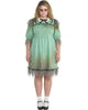 Run through the hallways of haunted hotels wearing this Dreadful Darling Womens Plus Size Costume or for your next Halloween party. This spooky costume includes a mint green dress that features three-quarter puff sleeves, a black bow tie at the neckline, a jagged hemline and patches of 'dirty' fabric to give that decayed look. Complete your creepy costume with a pair of white socks, and black shoes and paint zombie features on your face.