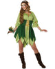 Step into a realm of myth and magic with this Woodland Elf Womens Costume. The green dress features an elastic neckline and a leaf-like hemline that whispers of ancient woods. Delicate ruched sleeves with more leaf-like trim and gold ribbon details add a touch of whimsy. A dark green overskirt, has matching leaf-like hemline and lace-up detailing. To complete your transformation, the costume includes a pair of elf ears and a beautiful floral headband. Perfect for wandering through a fairytale-themed party or casting a spell of charm over everyone you meet.