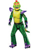 Unleash the guitar-shredding animatronic with this Five Nights at Freddys Glamrock Monty Gator Deluxe Boys Costume. This full-length digitally printed jumpsuit features an authentic green reptile pattern across the front and back, complete with an attached tail. The costume includes attached purple feet with black claws that function as shoe covers, integrating the look seamlessly. A yellow and green vest with defined 3D purple shoulder pieces emphasises the Glamrock armour. Finishing the transformation are green gloves with studded details and a detailed 3D plastic half mask of Monty Gator with an elastic strap for a secure fit. Perfect for Halloween, FNAF themed parties, or cosplay events, this costume invites you to unleash your inner rocker.