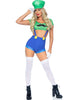 Race across a rainbow track or level up with your star collecting wearing this Gamer Sidekick Womens Costume. This super sexy costume includes a green short sleeve cropped top with a black moustache printed on the front, and a pair of blue figure hugging high waisted shorts with attached blue suspenders that come in a cheeky cut. The shorts also feature large yellow buttons on the front and around the back are printed images of a yellow star and a green mushroom. To show you are a true racer the costume comes with an oversized green newsboy-style hat with a heart printed on the front.