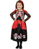 Your little one would love our Day of the Dead Toddler Costume. Featuring a Day of the Dead dress with a black skirt styled with floral sugar skull illustrations and a colourful ribcage on the bodice, plus black tulle long sleeves and red tulle on the shoulder. The costume comes complete with a black headband with an attached red rose.